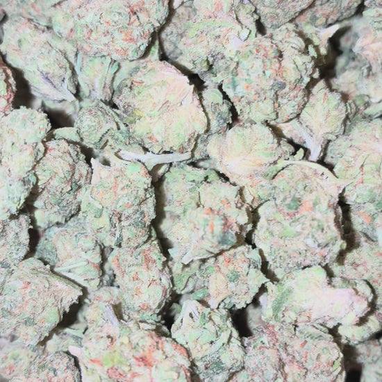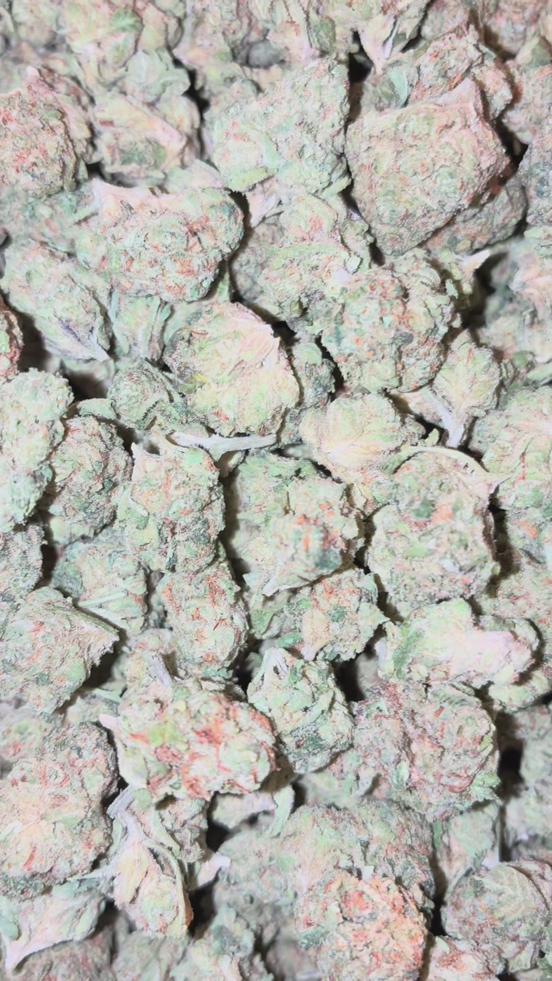 Dense, crystal-covered buds with rich green hues, bright orange hairs, and thick trichome frost. Pungent, sweet-and-gassy aroma that lingers.